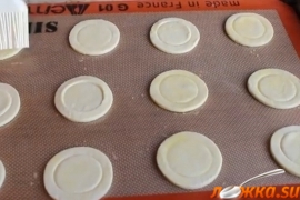 Возьмите формочку меньшим диаметром и вдавите посредине каждого кружка. Смажьте взбитым яйцом.