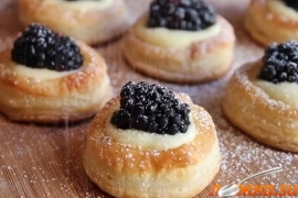 Разморозьте пласт готового слоеного теста в течении 2-3 минут. Рабочую поверхность присыпьте слегка мукой. Выложите на нее пласт теста и разверните.