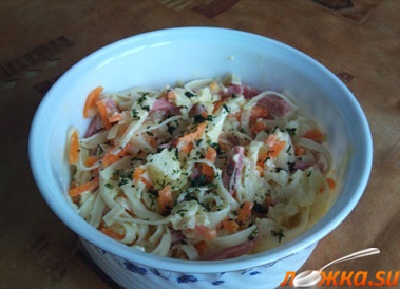 Ветчину порезать небольшими кубиками. Капусту разделить на кочешки, помыть и варить в подсоленной воде в течение 15 минут, затем откинуть на дуршлаг, чтобы стекла вода, и остудить. Макароны отварить в подсоленной воде, затем откинуть на дуршлаг и обдать холодной водой. Морковь вымыть, отварить, остудить, почистить и порезать небольшими кубиками. Сельдерей помыть, почистить и натереть на крупной терке. Все перемешать, посолить, поперчить. Приготовленным соусом заправить салат. Готовый салат с капустой и ветчиной перед подачей к столу украсить веточками укропа и петрушки.