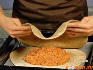 Противень накрываем пергаментом, помещаем на него круг из теста, выкладываем начинку. Оставшееся тесто раскатываем в круг несколько большего диаметра, чем первый. Накрываем им начинку, края защипываем.