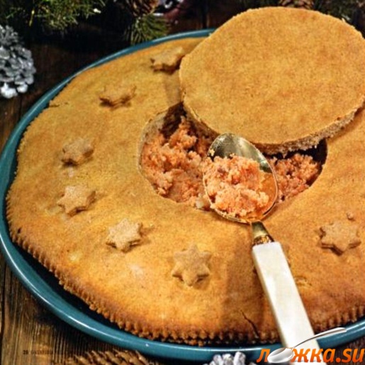 Из остатков теста вырезаем небольшие звездочки или цветочки и листики. Украшаем ими пирог, поверхность смазываем слегка взбитыми сливками и ставим в духовку, разогретую до 250°С на 15 минут. Температуру духовки уменьшаем до 140°С и готовим 2,5–3 часа, время от времени смазывая пирог с лососем маслом.