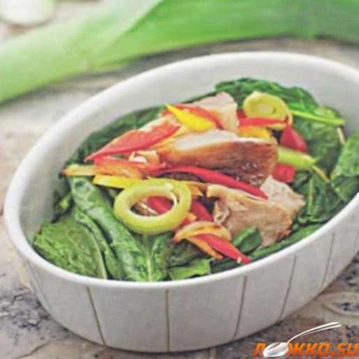 Вешенки и шпинат перебираем, промываем, твердые ножки и стебли удаляем. Порей нарезаем кольцами, сладкий перец – полосками.