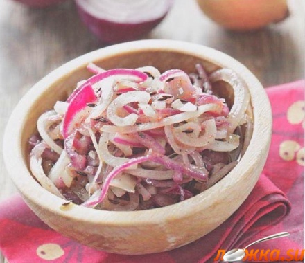 В миску кладем желтый лук, а белый и красный пока оставляем.