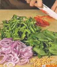 Лук и перчики чистим, нарезаем тонкими кольцами. Рукколу мелко режем. Базилик разбираем на листики. Кедровые орешки обжариваем 7 минут в 1 ст. ложке разогретого оливкового масла, помешивая.