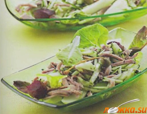 Салат с языком и огурцами подавать на листьях латука с запеченной свеклой.