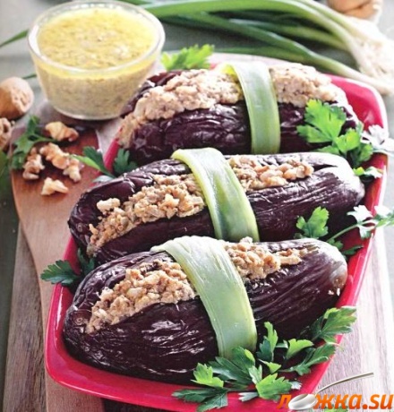 Получившимся ореховым соусом заполняем «кармашки» в баклажанах. Баклажаны аккуратно перевязываем стеблями сельдерея, укладываем в широкую миску и заливаем оставшимся соусом.