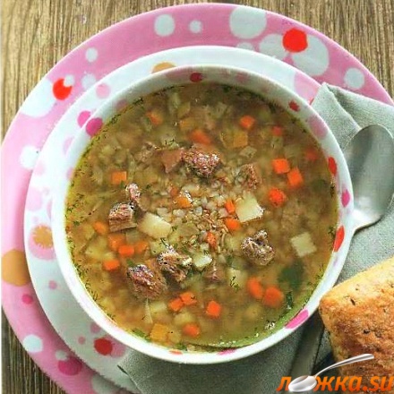 На среднем огне на сухой сковороде обжариваем гречу, потряхивая, 3–4 минуты. Бульон доводим до кипения, кладем картофель и гречку, снова доводим до кипения, варим на слабом огне 10 минут. Добавляем кусочки мяса, обжаренные морковь, сельдерей и лук, варим еще 5–7 минут.