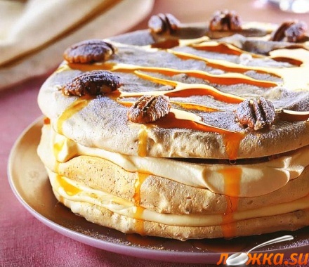 Раскладываем орехи и каждый поливаем кленовым сиропом.Сверху намазываем еще слой сливок, посыпаем орехами и накрываем третьим коржом безе. Ставим на 4 часа в холодильник. Перед подачей на торте раскладываем целые орехи пекана и каждый орешек поливаем кленовым сиропом.