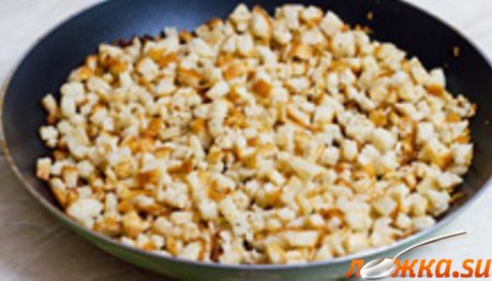 Хлеб режем маленькими кубиками и обжариваем на растительном масле до золотистого цвета.