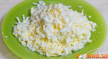 Яйца варим, остужаем , чистим и трем на крупной терке.