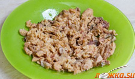 онсервированную горбушу выкладываем на тарелку и разминаем вилкой.