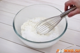 Смешайте в отдельной миске муку, сахар, разрыхлитель, соду и соль. Отдельно смешайте сметану и молоко. Поставьте обе емкости в холодильник.