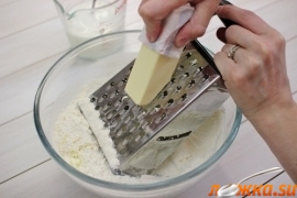 Очень важно охладить все ингредиенты для теста. Сливочное масло перед применением должно быть замороженным. Если вы будете использовать теплые ингредиенты, тесто при выпекании станет плотным и жестким. Готовое тесто должно быть с кусочками сливочного масла, не полностью однородным. Натрите масло на терке в миску с сухими ингредиентами.