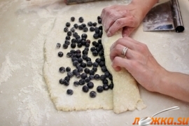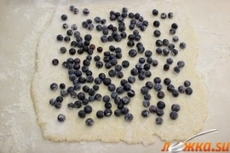 Сложите тесто втрое и положите в морозилку на 5 минут. Затем снова раскатайте квадрат. Не пропускайте этот шаг, который позаимствован из приготовления слоеного теста. К тому же это очень легко! Выложите сверху охлажденные ягоды черники.