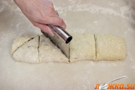 Разрежьте рулон на 4 одинаковых части. Затем каждую нарежьте по диагонали пополам. Подготовленные булочки можно заморозить и хранить в морозилке в течении 3 месяцев.