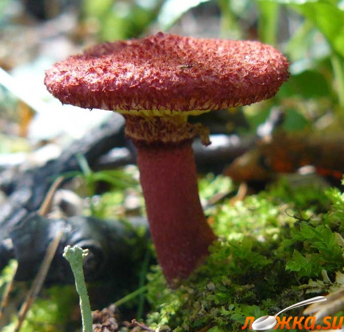 По своей форме похож на другие, но его шляпка пурпурно-красная и ножка ниже кольца также красного цвета. А выше него ножка и трубчатый слой окрашены в желтый цвет.