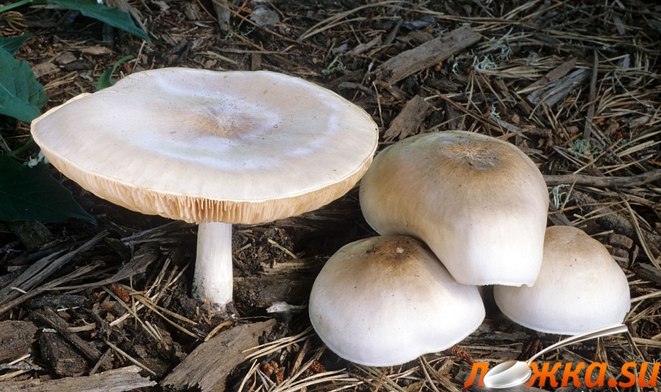 Обладает толстомясистой шляпкой с углублением в центре и диаметром, достигающим пятнадцати сантиметров. Края шляпки могут быть как ровными, так и подвернутыми. Сероватая поверхность шляпки в центре покрыта прижатыми чешуйками коричневого цвета. Широкие пластинки шляпки обладают розоватым цветом. У цилиндрической ножки расширенное основание с волокнистым налетом. Ватообразная грибная мякоть обладает сладковатым вкусом и приятным грибным запахом.