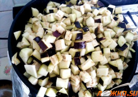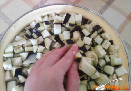 Баклажаны моем, режем кубиками и замачиваем в соленой воде на 30 минут.
