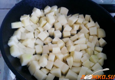 Картофель чистим, режем кубиками и выкладываем на разогретую сковороду с маслом.
