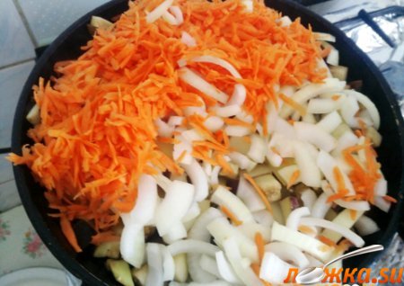Морковь трем на терке, лук режем полукольцами. Добавляем в сковороду.