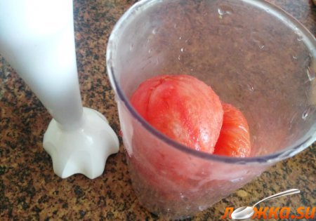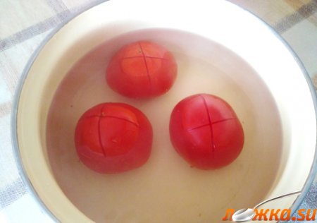 На помидорах делаем крестообразные надрезы, кладем в кипяток на пару минут.