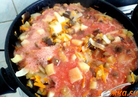 Заливаем сверху овощи, солим, перемешиваем, закрываем крышкой и тушим на маленьком огне до готовности.