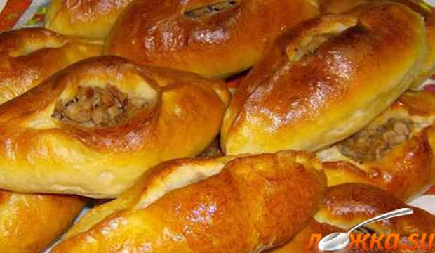 Затем шарики раскатать в круглые лепешки, на середину лепешек положить порции начинки, края теста приподнять и защипнуть, оставив середину открытой (расстегнутой).