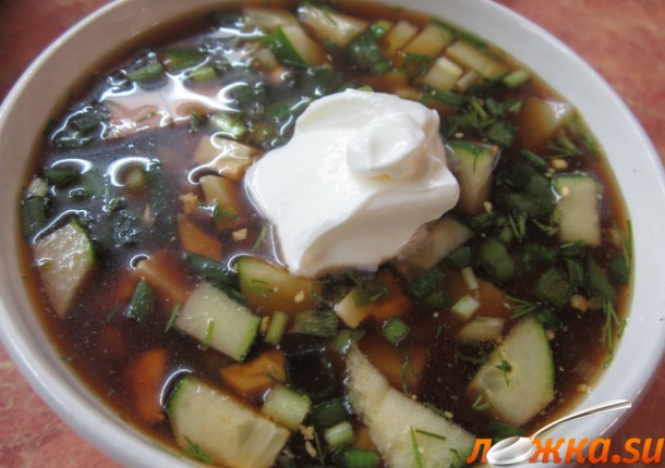 Яйца и картошку отварите. Редьку почистите, помойте и нашинкуйте соломкой. С картофеля снимите шкуру и нарежьте его кубиками. Яйца, зелень и зеленый лук тоже мелко порежьте. Сложите все ингредиенты в кастрюлю, залейте квасом, посолите и разлейте суп по тарелкам, добавив к нему сметану.