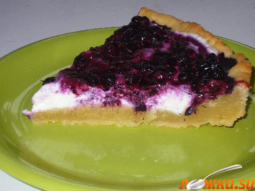 Тесто выкладываем в форму для выпекания, смазанную растительным маслом. Делаем бортики высотой 1-1,5 см. Выпекаем при температуре 180 градусов в течении 30 мин. Достаем из духовки, даём остыть. Творог смешиваем с 2 ст. л. сметаны, 2 ст. л. сахара и ванилином. Хорошо растираем смесь до состояния крема. Выкладываем творог на остывший корж. Чернику высыпаем в кастрюлю, посыпаем 2 ст. л. сахара и ставим на медленный огонь до кипения. Воду не добавляем. После закипания черники, снимаем ее с огня, охлаждаем и поливаем ягодным соусом наш пирог.