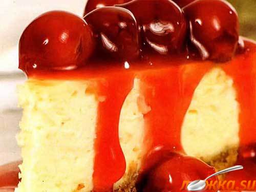 4. Крахмал развести в 150 мл холодной воды. Вишню засыпать сахаром, влить 200 мл воды и довести до кипения. Ввести раствор крахмала, перемешать, убрать с огня. Готовый чизкейк разрезать на порции, полить соусом.