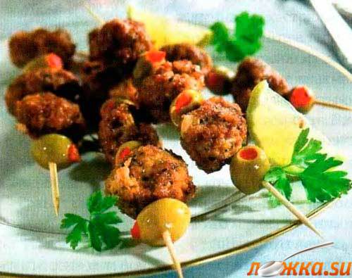 Очищаем чеснок, мелко нарезаем вместе с петрушкой. Смешиваем с мясом, яйцами, солью, тёртым сыром, перцем. Из полученного фарша формируем небольшие шарики и обжариваем на оливковом масле. Перекладываем фрикадельки на бумажное полотенце, чтобы впитался лишний жир, а потом нанизываем их на шпажки, чередуя с оливками.