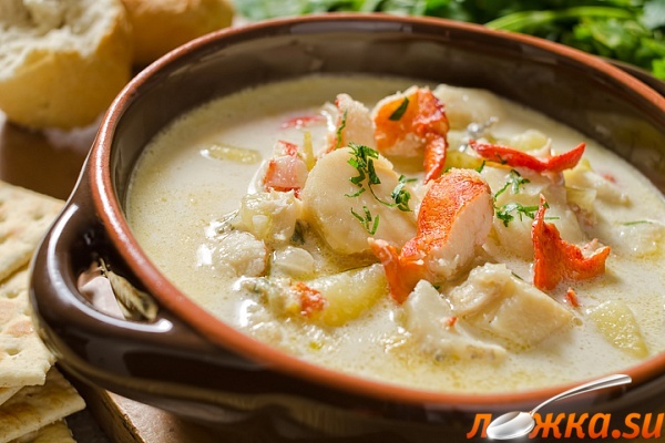 Картофель, морковь и лук очистить, нарезать маленькими кубиками. Сельдерей вымыть и нарезать тонкими ломтиками. Бекон нарезать небольшими кусочками и обжарить в кастрюле в разогретом оливковом масле, 4 минуты. Добавить к бекону лук, морковь, сельдерей и обжарить, постоянно помешивая, на среднем огне 10 минут. Всыпать муку, хорошо размешать и жарить еще 7 минут. Помешивая, медленно влить в кастрюлю 2 л горячей воды. Дать закипеть, положить картофель. Варить 5 минут. Филе форели нарезать крупными кубиками. Мясо краба разобрать на небольшие кусочки. Добавить в суп и варить 4 минуты. В сотейнике смешать молоко со сливками, довести до кипения и влить в суп. Добавить соус табаско, соль и перец, прокипятить 1 минуту. При подаче к столу посыпать зеленью.