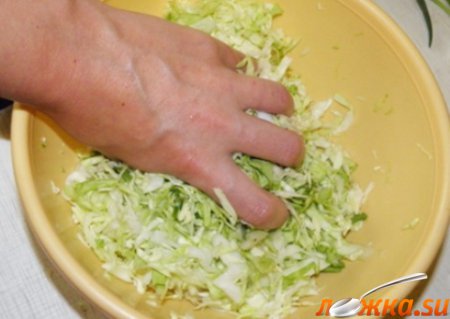 Капусту тонко шинкуем, слегка солим, мнем руками.