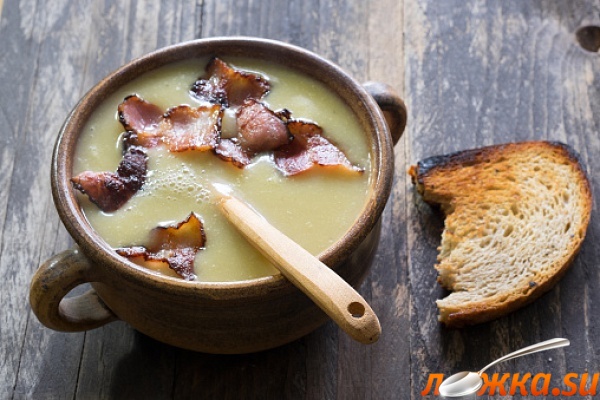 Сварить бульон из свинины и 1,5-2 л воды. Мясо вынуть, снять с кости и нарезать небольшими кусочками. Сложить в миску, накрыть и отставить. Бульон процедить. Горох промыть и замочить на 30 мин. Лук и морковь очистить и мелко нарезать. Бекон и грудинку нарезать небольшими кусочками, хлеб – кубиками. В кастрюле разогреть масло, обжарить бекон, 1 мин. Добавить лук и морковь, готовить 4 мин. Влить в кастрюлю процеженный бульон. Горох откинуть на дуршлаг, еще раз промыть и добавить в бульон. На сильном огне довести суп до кипения, снять пену. Уменьшить огонь, посолить, накрыть крышкой и готовить 30 мин. Чеснок очистить и измельчить. Добавить в суп кусочки свинины, чеснок и орегано. Перемешать и снять с огня. Разогреть духовку до температуры 200 градусов. Разлить суп по горшочкам и поставить в духовку на 15 мин. Разогреть сухую сковороду. Обжарить на ней грудинку до хрустящей корочки. Добавить хлебные кубики и обжарить до золотистого цвета.