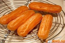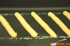 Выложить эклеры на противень. Противень - лучше всего с антипригарным покрытием, ничем не смазывать. Если нет - то силиконовый коврик или слегка смазать противень маслом и протереть.