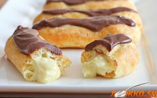 Эклеры смазать взбитым до однородности с щепоткой соли и процеженным яйцом. Вилкой, смоченной в яйце, провести линии вдоль эклера. Это поможет ему равномерно подняться и не взорваться в духовке. Разогреть духовку до 250-260С. Поставить противень с эклерами, и выключить. Совсем. На 10-15 мин., пока эклеры не поднимутся и не начнут румяниться, или же пока температура духовки не упадет до 160С. В этот момент снова включить духовку на 170С, не открывая, и печь до готовности. Выложить на решетку. Готовые эклеры наполнить заварным кремом (в этом случае с добавлением кофейного экстракта) и покрыть помадой.