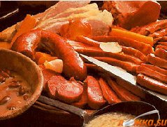 В другой кастрюле разогреть свиной жир и пожарить на нем лук до прозрачности, добавить чеснок, помидоры, сладкий перец и капусту и при непрерывном помешивании все вместе немного пожарить. Потом под крышкой на медленном огне 20 минут потушить.