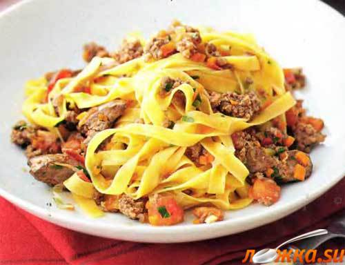 1. Обжарить фарш в масле, разбивая комки вилкой, до изменения цвета. Шумовкой переложить его из сотейника на тарелку. Сливочное масло и очищенные, нарезанные маленькими кубиками морковь, лук, сельдерей и сладкий перец тушить на слабом огне, помешивая, до мягкости, 10-15 мин.
