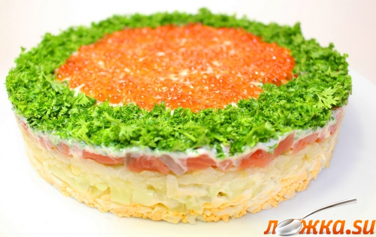 Салат выложить слоями с помощь разъёмной формы диаметром 22 см. Первый слой яйца, следом огурцы, майонез, картофель, рыба, майонез. Украсим зеленью и икрой.