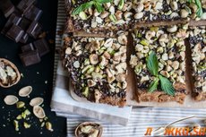 6. После того, как всё будет готово, нанесите расплавленный шоколад равномерным слоем на основу пирога и посыпьте сверху орехами.