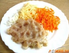 Делаем начинку: картофель и морковь трем на терке, лук мелко режем. Добавляем фарш, солим, перчим . Не перемешиваем, потому что начинку выкладываем слоями.
