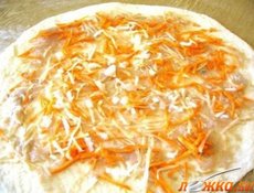 Сначала выкладываем на тесто лук, затем фарш, натертый картофель и морковку.