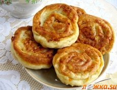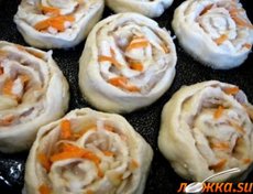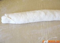 Тесто аккуратно скручиваем в трубочку и острым ножом разрезаем ее на рулеты по 1,5-2 см.