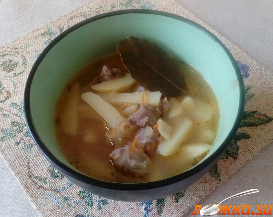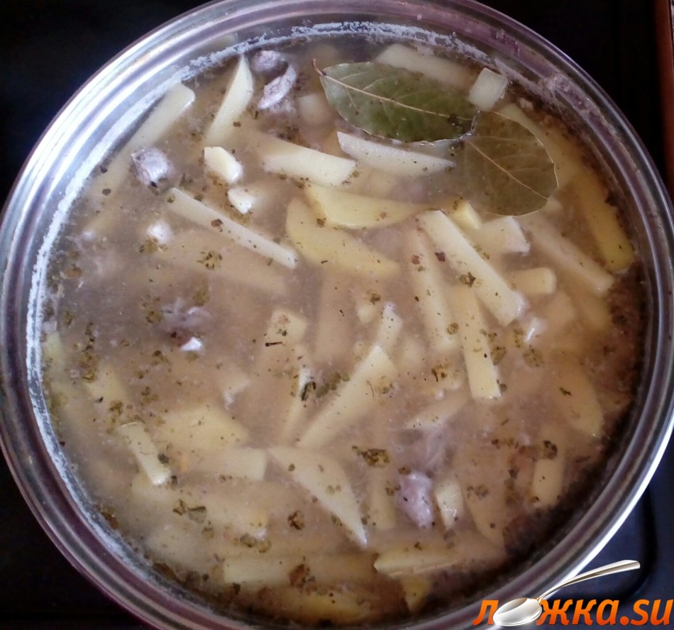 По истечении 30 минут после закипания воды, бросаем в кастрюлю картофель. Солим, перчим, добавляем лавровый лист.