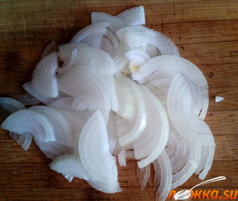 Готовим зажарку. Лук режем полукольцами.