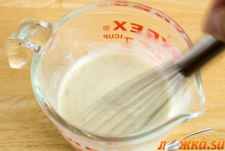 Делаем соус: взбиваем йогурт со сметаной, лимонным соком, горчицей, солью и перцем.