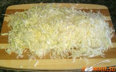 Капусту нашинкуйте тонкой соломкой, мнем руками.