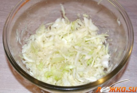 Капусту тонко шинкуем, солим, мнем руками и выкладываем в салатник.