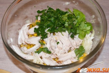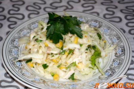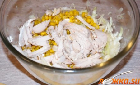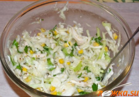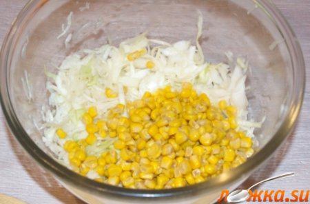 С кукурузы сливаем жидкость и добавляем к капусте.