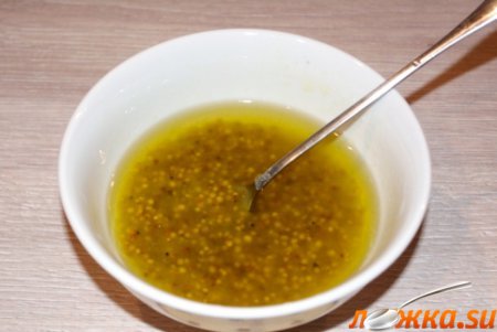 Смешиваем мед , горчицу с зернами, растительное масло, соль и черный молотый перец. Хорошо взбиваем.